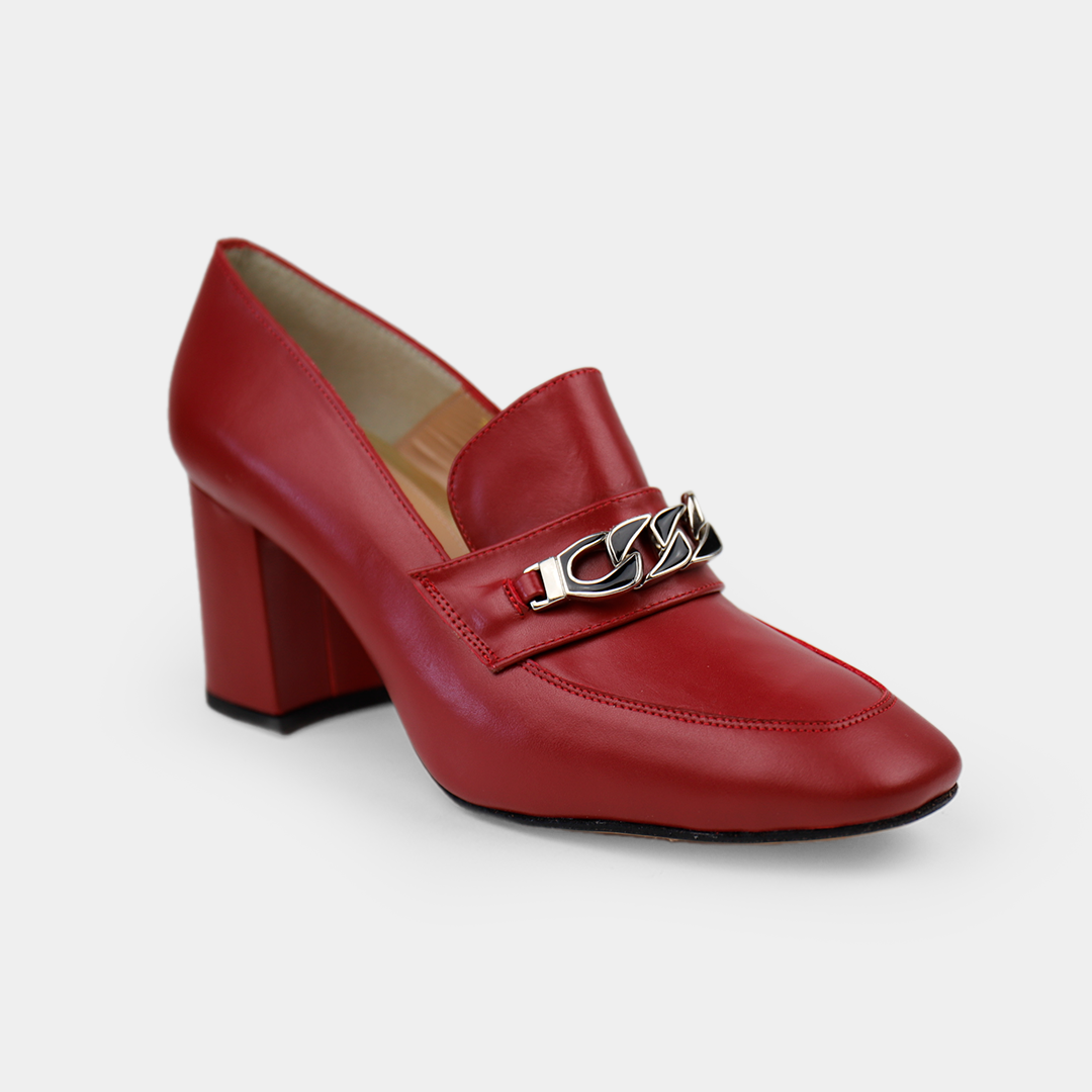 Zapatillas de tacón ancho, de color rojo, fabricadas en piel de primera calidad. Llevan un herraje de cadena que le agrega un toque moderno y decorativo. La punta del zapato es ligeramente cuadrada, lo que aporta un estilo clásico y refinado. Este tipo de calzado es ideal para usar en ocasiones formales o para agregar un toque chic a un atuendo casual.